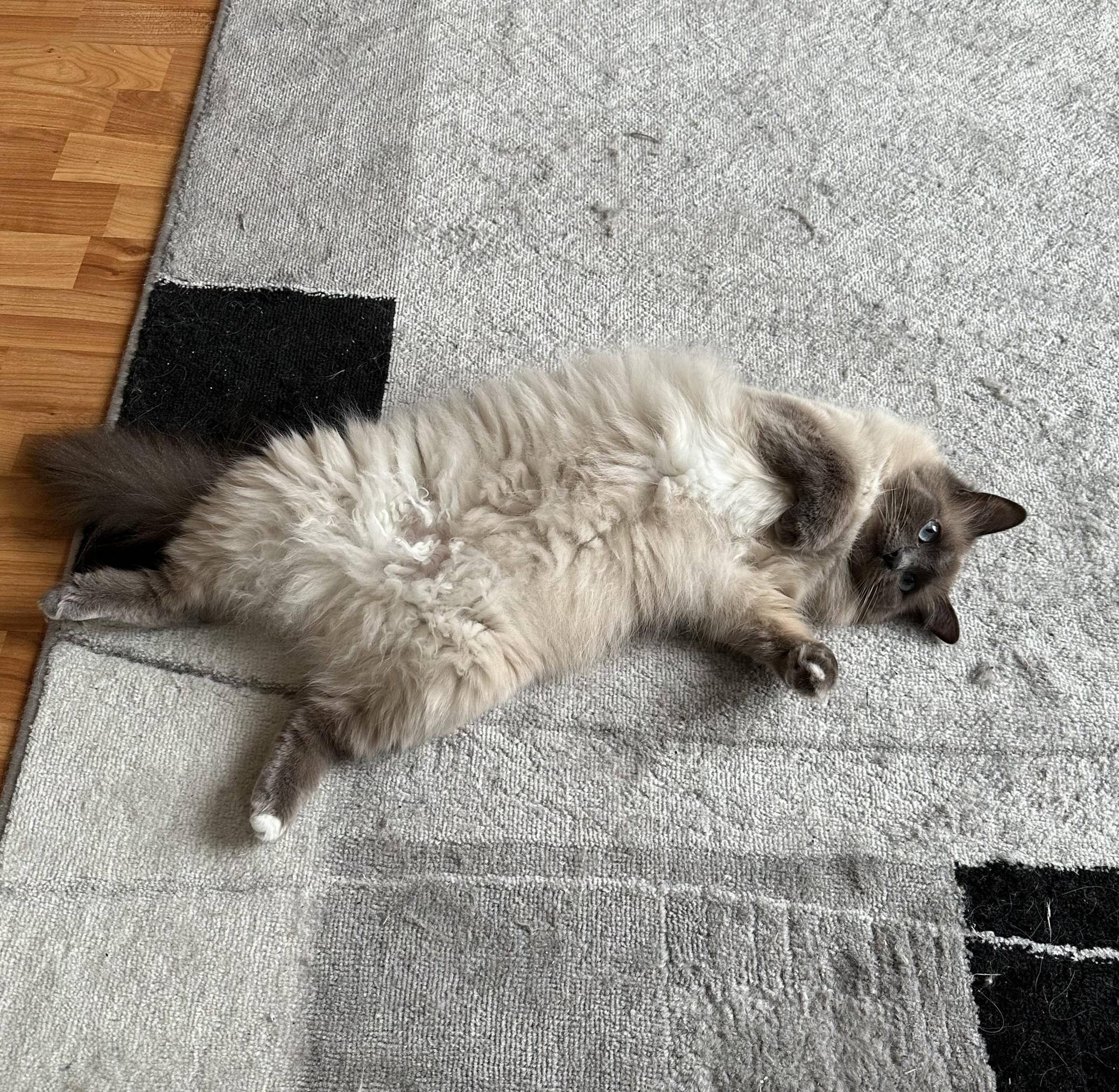 sprawled across the floor the cat and its belly trap set waiting to commence