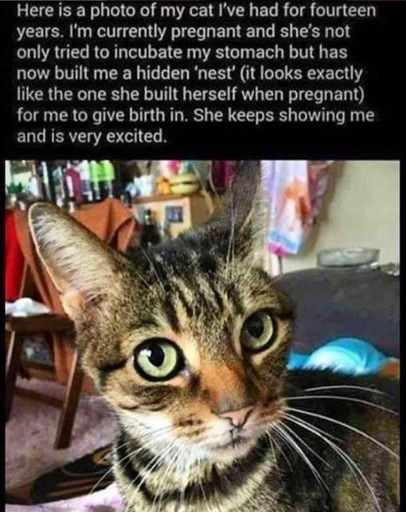 The kitty is going to be so disappointed though when her human doesn’t give birth in the nest she built with great effort…