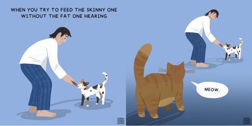 You try to feed your skinny girlfriend, but the fat one comes running around the corner like “meow!”