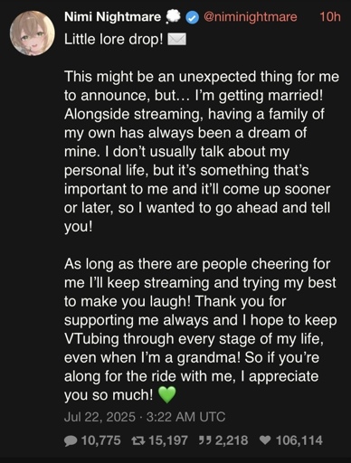Syrc@lemmy.world to VTubers@sh.itjust.worksEnglish · 7 months agoNimi is getting married!lemmy.worldimagemessage-square10linkfedilinkarrow-up136arrow-down15file-text