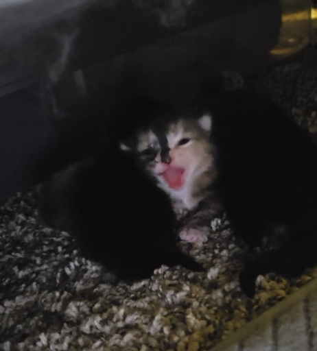 The kittens are now a week old, and for this post I’ll focus on mom’s mini me. She’s a tortie calico and evidently has the personality to show for it. She started opening her eyes yesterday and started… Breathing heavily at us. We wondered if she had a respiratory issue, but she’s totally fine when we aren’t around so… She’s hissing at us.