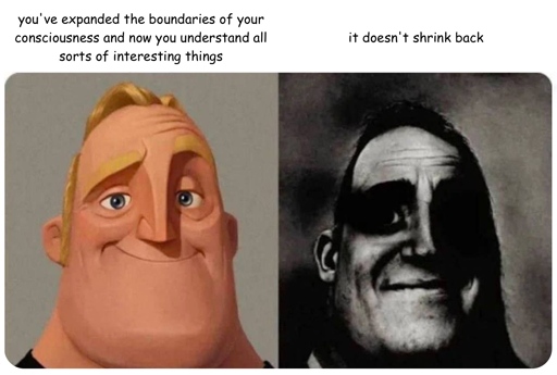 minus-squareNarri N.@lemmygrad.mllinkfedilinkarrow-up7·2 months agooh yeah, i loved it when i got somewhat better from my own internal haze (depression and bpd and anxiety and shit) only to realize the world’s actually gone to shit, and now i can clearly see what and why and how.
