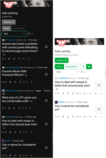 [Edit: on the left is when viewed from lemmy.world; on the right is when viewed from sh.itjust.works.]