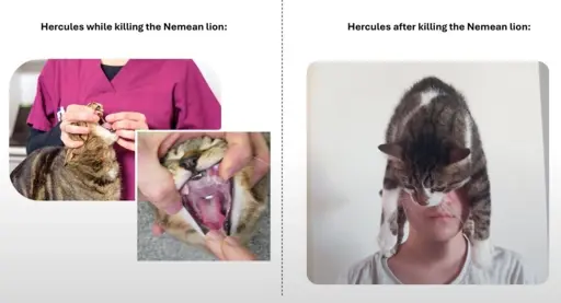 Explanation: In the Greek mythic figure Hercules’ battle against the Nemean Lion, the lion was invulnerable to weapons. So Hercules killed it with his bare hands. Some depictions may look familiar to those who have had to give their cats medication.