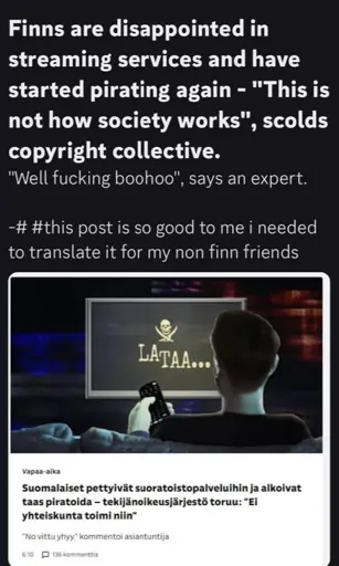 lanigerous@feddit.uk to Piracy: ꜱᴀɪʟ ᴛʜᴇ ʜɪɢʜ ꜱᴇᴀꜱ@lemmy.dbzer0.comEnglish · edit-24 months agoGood old Finland (subtitle is commentary, not in text)lemmy.blahaj.zoneimagemessage-square34linkfedilinkarrow-up1492arrow-down16file-text