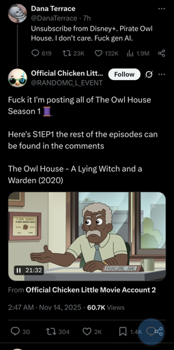 LiamBox@lemmy.ml to Piracy: ꜱᴀɪʟ ᴛʜᴇ ʜɪɢʜ ꜱᴇᴀꜱ@lemmy.dbzer0.comEnglish · 5 months ago'The Owl House’ creator Dana Terrace situation with Disney+ positive views on AI generated contentlemmy.mlimagemessage-square56linkfedilinkarrow-up1474arrow-down14