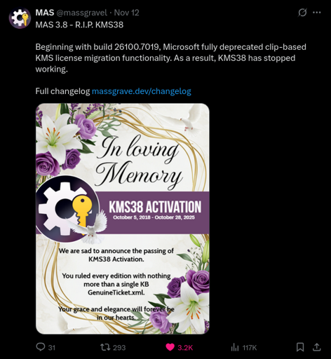 arrow-up1406arrow-down1imageMicrosoft has blocked Massgrave's KMS38 activation method for Windowslemmy.mlmr_MADAFAKA@lemmy.ml to Piracy: ꜱᴀɪʟ ᴛʜᴇ ʜɪɢʜ ꜱᴇᴀꜱ@lemmy.dbzer0.comEnglish · 3 months agomessage-square132linkfedilinkfile-text