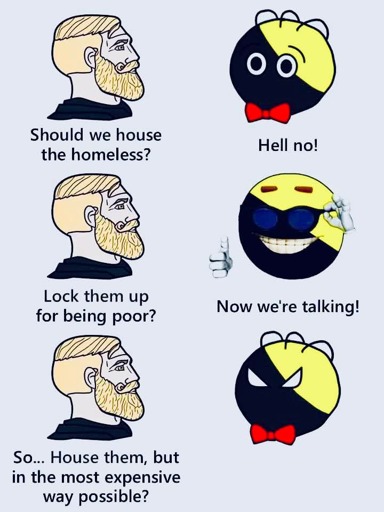 And after all that, any able-bodied people who still insist on sleeping & shitting on the streets & refusing to contribute to society & the economy, can be scooped up like kitty litter and dumped into for-profit prisons where they’ll be assigned jobs.