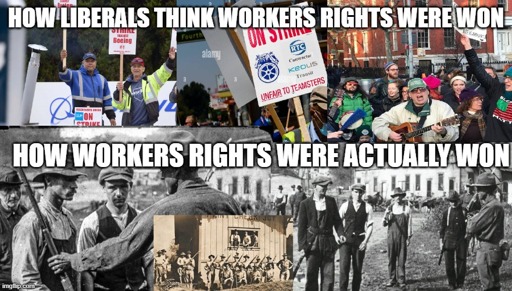 if factories didn’t get set on fire with the owner inside people would still be breaking their backs working 16h a day in conditions that shorten their lives by a year every month spent working, every day going deeper in dept to the company store. Oh and they asked for better conditions, they protested, they demanded, they went on strikes, but there was no way out.