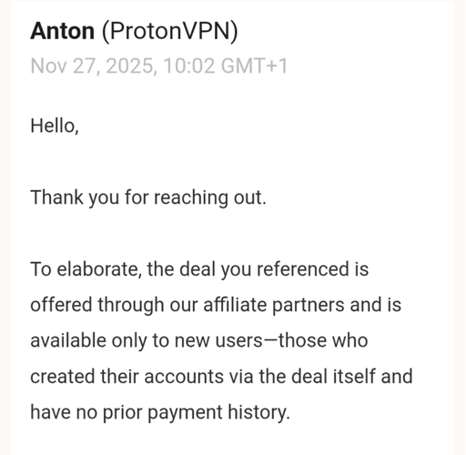 I saw the new promo for proton duo, marketed as $119 for two users this black Friday. I spent $220 some dollars on an individual plan for a 2 year term for a single user abt 2 years ago. I want a prorated refund or a better deal on individual rates because this is becoming major bs the more I’m thinking about renewing my subscription