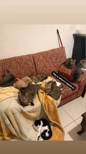 There was actually one cat behind the blanket as well where the black-and-white cat is sitting on the floor. But yeah, there’s six more cats somewhere around the house that could fit there.