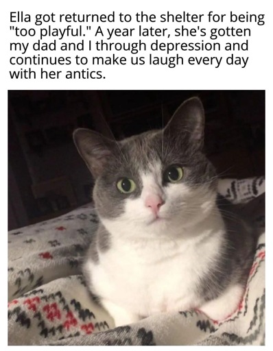 Yeah, I’m wondering if too playful meant too attackey? Once we got a cat who had a “clean” history. He was so sweet and snuggly except he’d get in this zone where he would crash out and attack our legs and bite. We tried everything we could think of, my partner and I had had like 15 cats previously between us. No amount of play time, novelty in toys, attention, affection, space, whatever made him not attack our ankles and bite. I started feeling too anxious to walk across the house to the kitchen. With a sick pit in our stomachs we had to bring him back to the shelter. There we found out we had been lied to and he had lived as an outdoor cat for a while, and had been returned once before for biting. We had a 3 bedroom house and a screened in porch but it just wasn’t enough for him. We were also discouraged from reporting the biting as it would “make it harder to rehome him.”