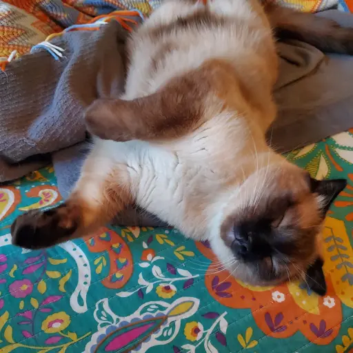 Awwww, she looks quite content on her heating pad. Wart is just a baby, his first birthday is this week! We have had a few sia‐meezers and they have all been scream machines. They really do love to check the whole house for changes before settling in their same favorite spots.